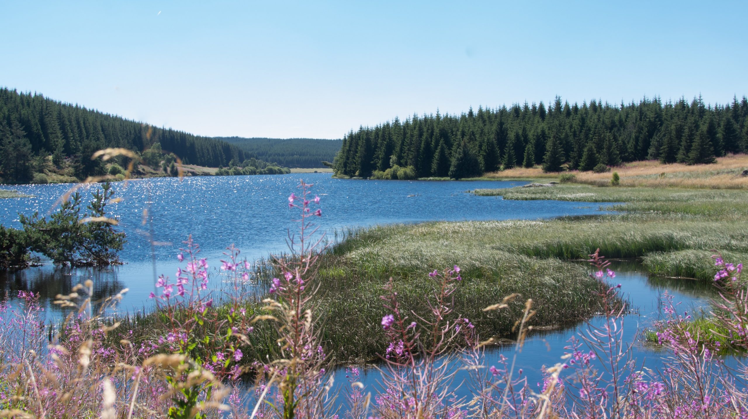 Nous voilà arrivés sur le Plateau du Roy, au cœur de la Montagne de la Margeride, à plus de 1 300 mètres d’altitude. Pour commencer, un grand parking permet de se garer sans difficulté, à proximité du lac.